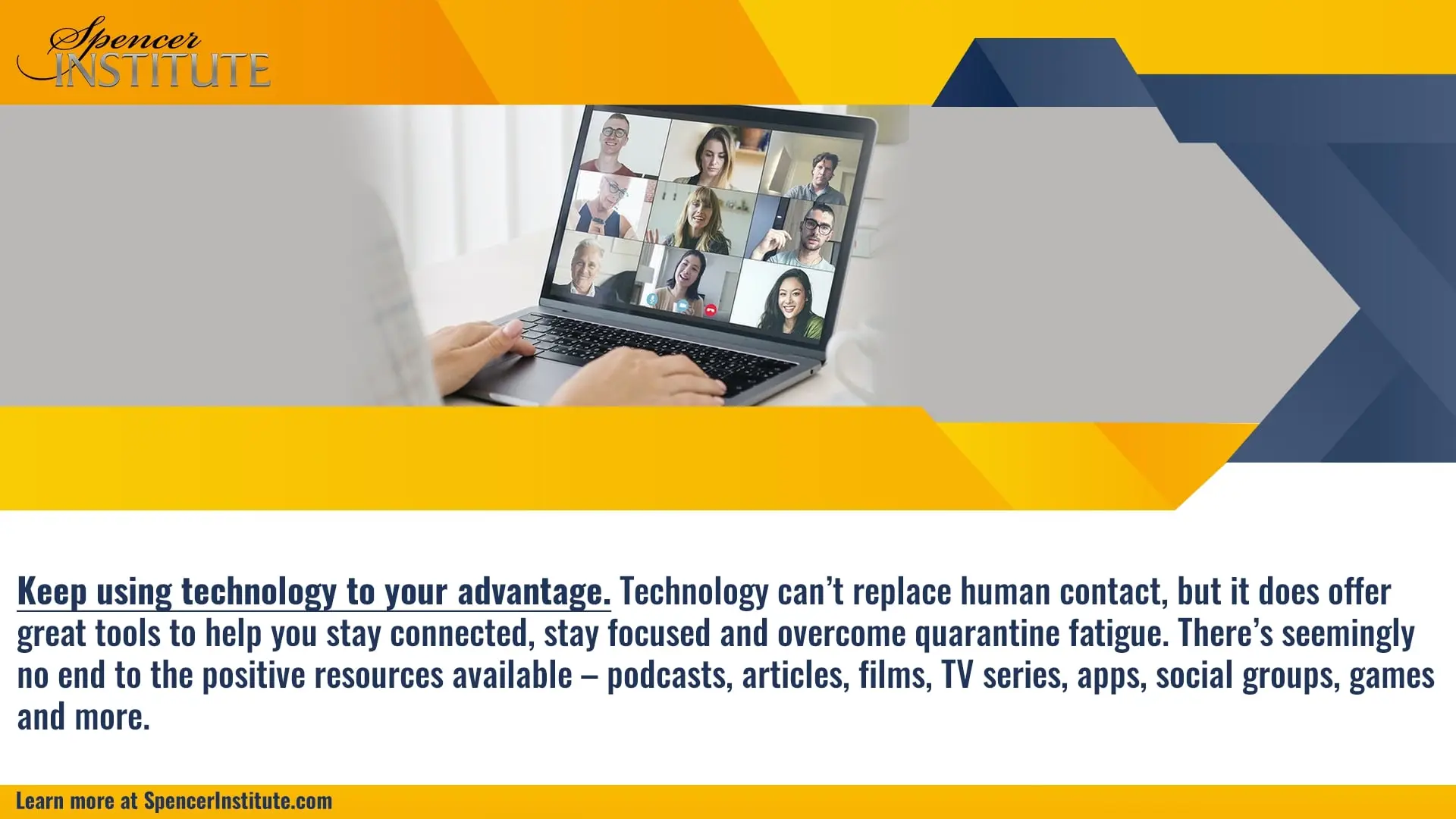 Technology can’t replace human contact, but it does offer great tools to help you stay connected, stay focused and overcome quarantine fatigue. There’s seemingly no end to the positive resources available – podcasts, articles, films, TV series, apps, social groups, games and more.