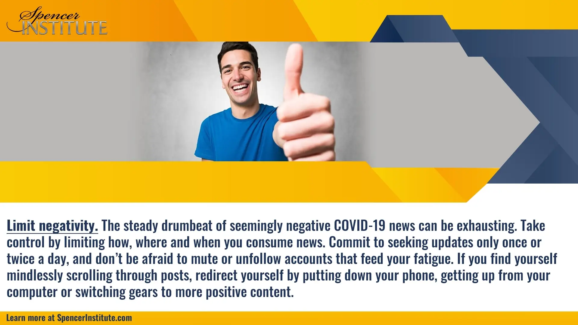 The steady drumbeat of seemingly negative COVID-19 news can be exhausting. Take control by limiting how, where and when you consume news. Commit to seeking updates only once or twice a day, and don’t be afraid to mute or unfollow accounts that feed your fatigue. If you find yourself mindlessly scrolling through posts, redirect yourself by putting down your phone, getting up from your computer or switching gears to more positive content.