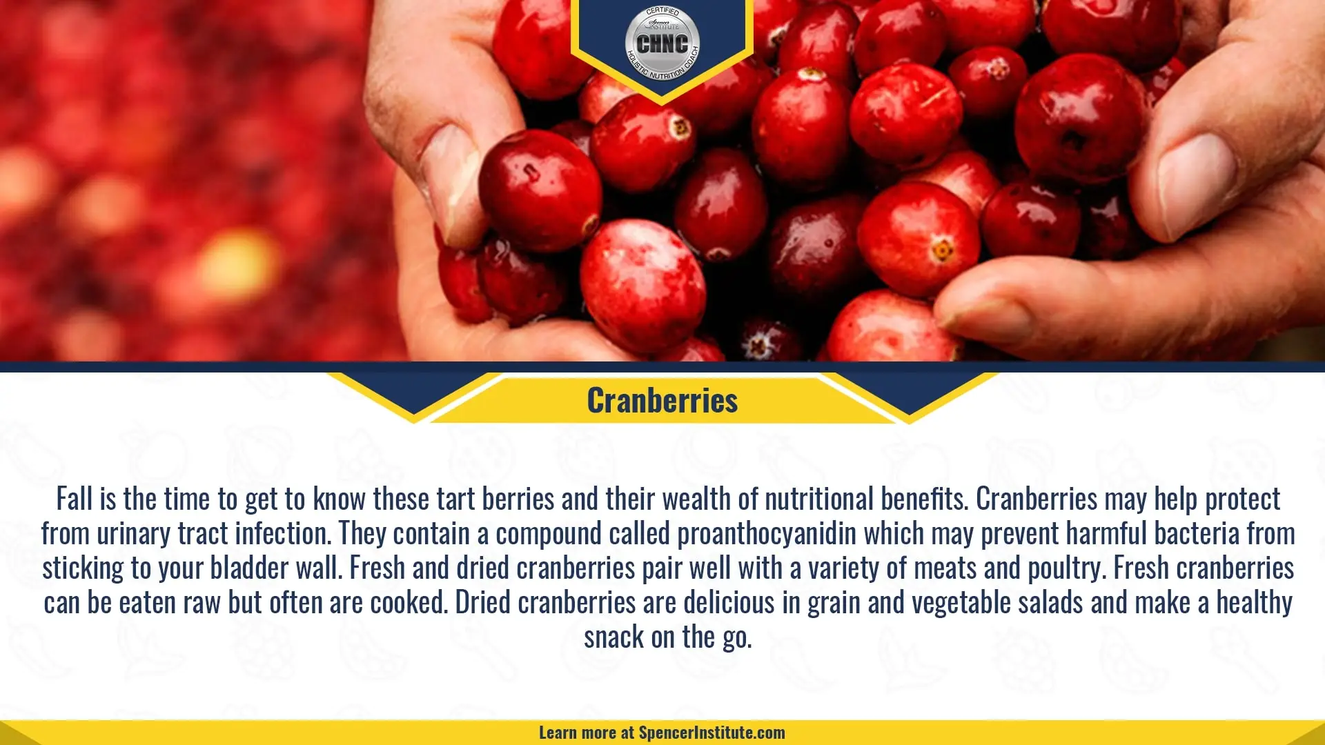 Cranberries may help protect from urinary tract infection. They contain a compound called proanthocyanidin which may prevent harmful bacteria from sticking to your bladder wall. Fresh and dried cranberries pair well with a variety of meats and poultry. Fresh cranberries can be eaten raw but often are cooked. Dried cranberries are delicious in grain and vegetable salads and make a healthy snack on the go.