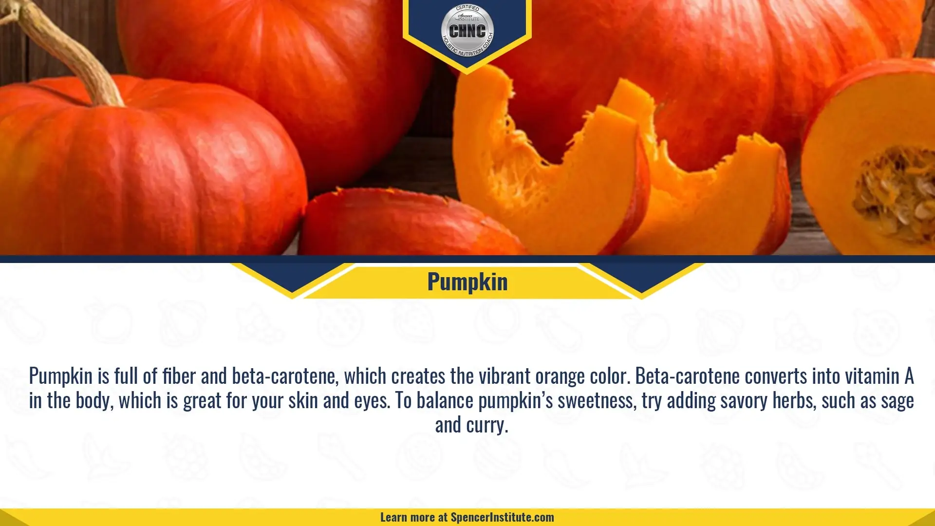 Pumpkin is full of fiber and beta-carotene, which creates a vibrant orange color. Beta-carotene converts into vitamin A in the body, which is great for your skin and eyes. To balance pumpkin’s sweetness, try adding savory herbs, such as sage and curry.