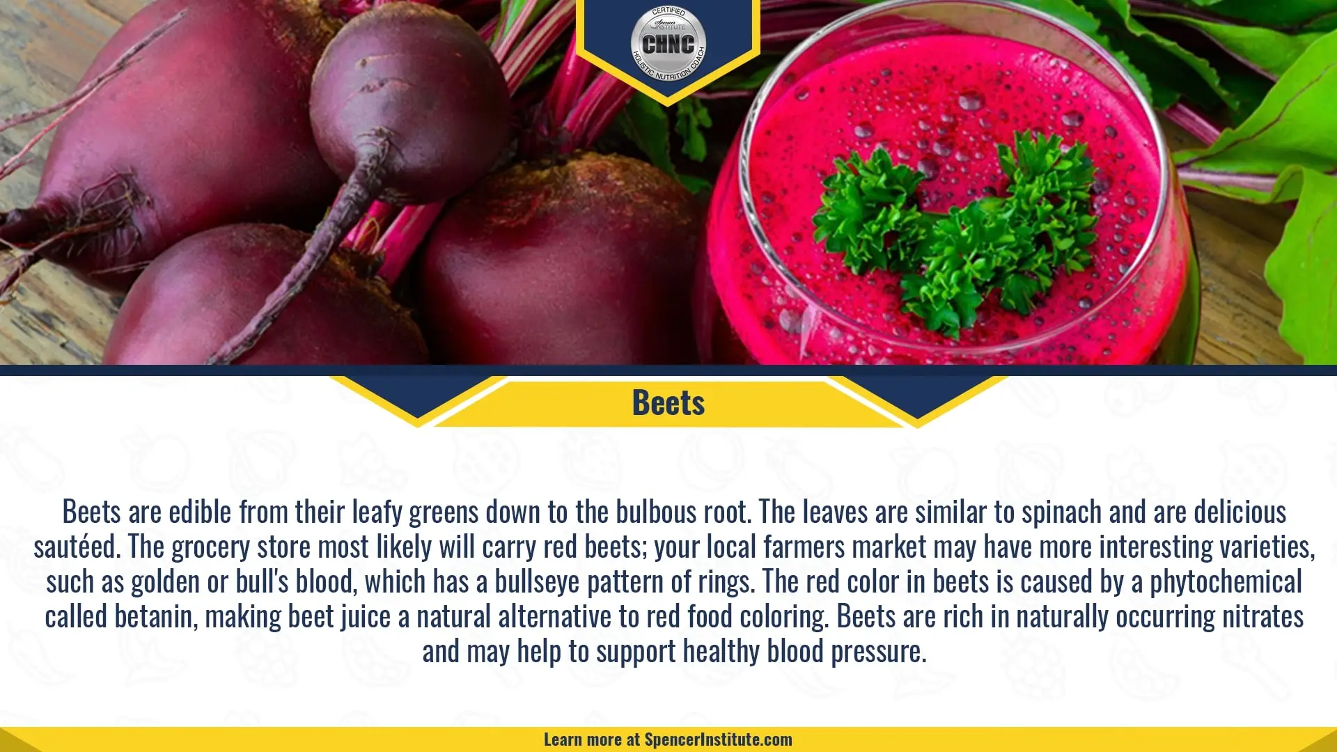 Beets are edible from their leafy greens down to the bulbous root. The leaves are similar to spinach and are delicious sautéed. The grocery store most likely will carry red beets; your local farmers market may have more interesting varieties. The red color in beets is caused by a phytochemical called betanin, making beet juice a natural alternative to red food coloring. Beets are rich in naturally occurring nitrates and may help to support healthy blood pressure.