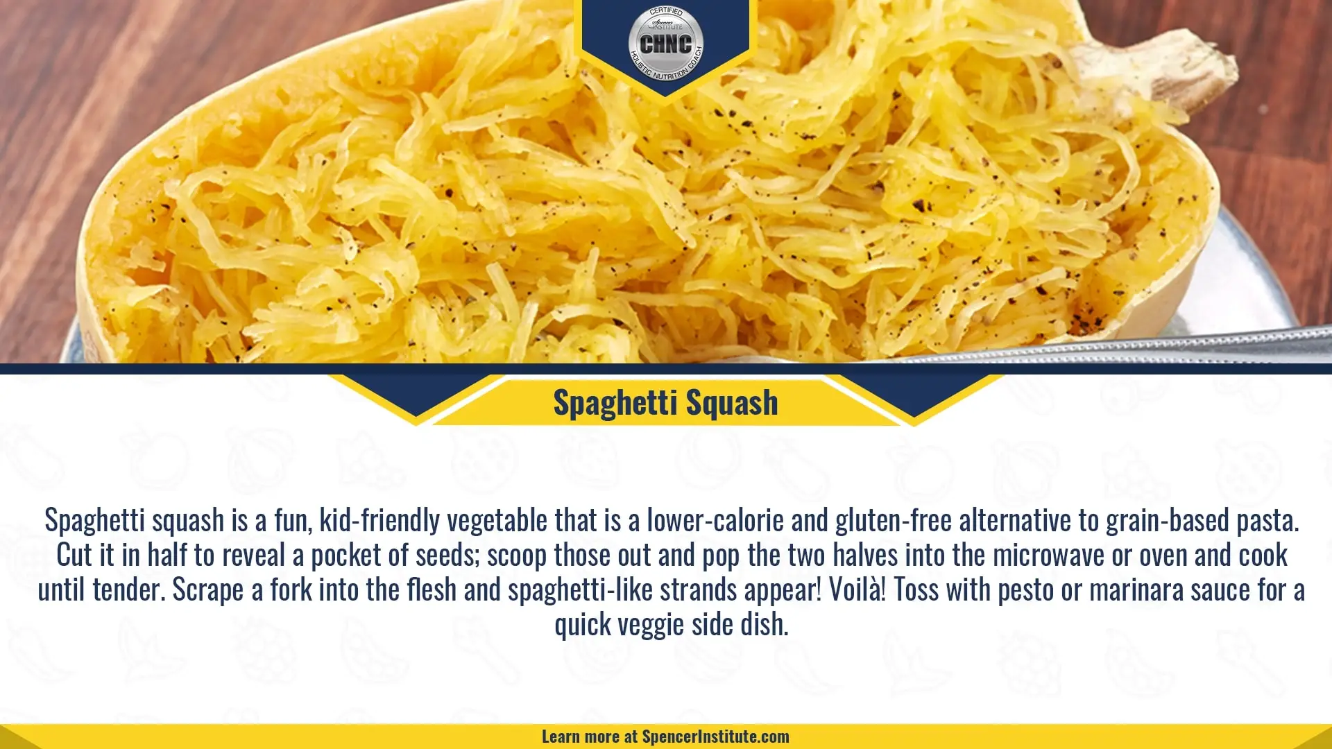Spaghetti squash is a fun, kid-friendly vegetable that is a lower-calorie and gluten-free alternative to grain-based pasta. Scrape a fork into the flesh and spaghetti-like strands appear. A wide variety of vitamins and minerals are contained in spaghetti squash. Most notably, this squash offers plenty of vitamin C, vitamin B6, niacin, potassium, manganese, and even some calcium.