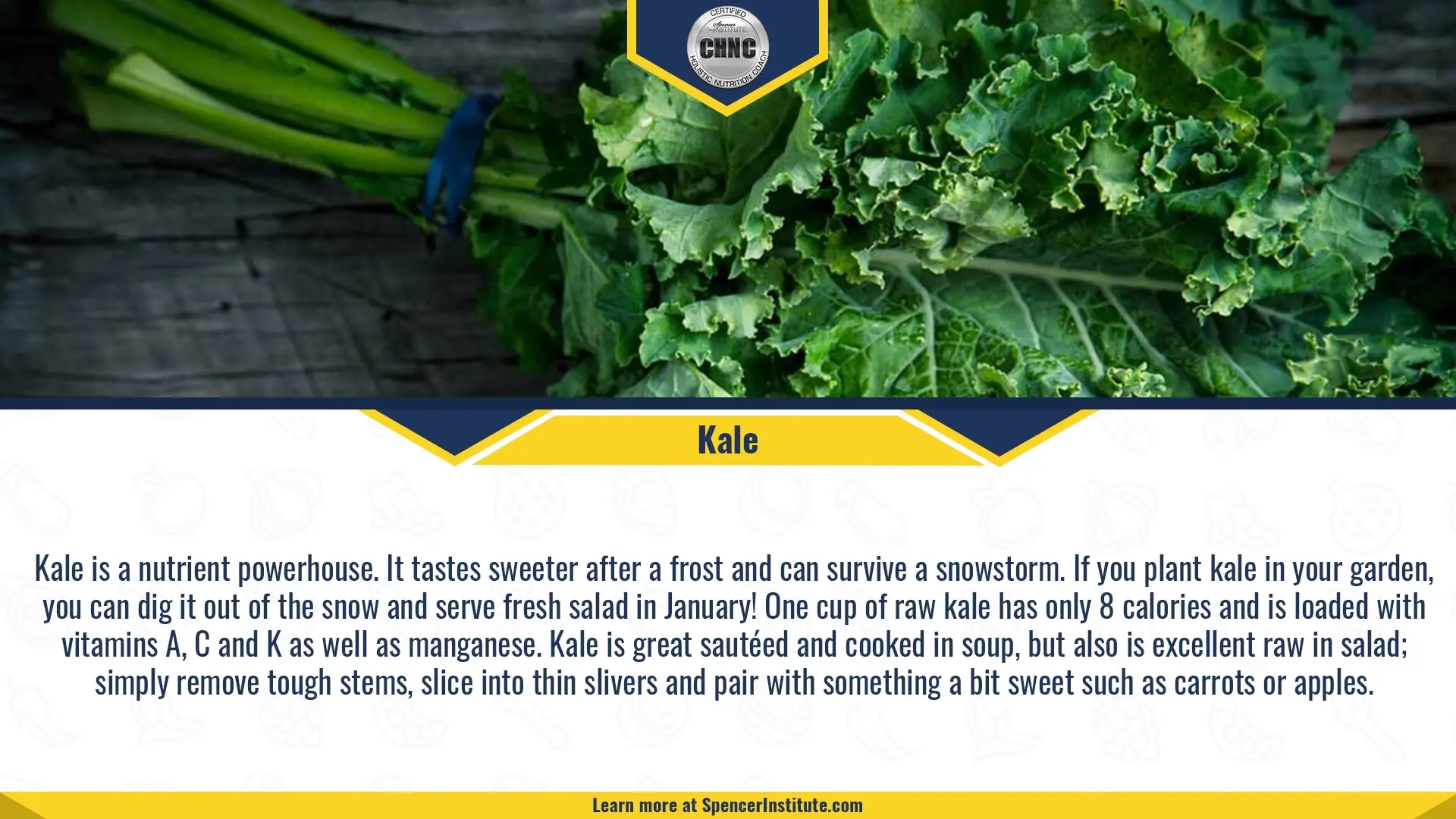 Kale is a nutrient powerhouse. It tastes sweeter after a frost and can survive a snowstorm. One cup of raw kale has only 8 calories and is loaded with vitamins A, C, and K as well as manganese. Kale is great sautéed and cooked in soup, but also is excellent raw in a salad.