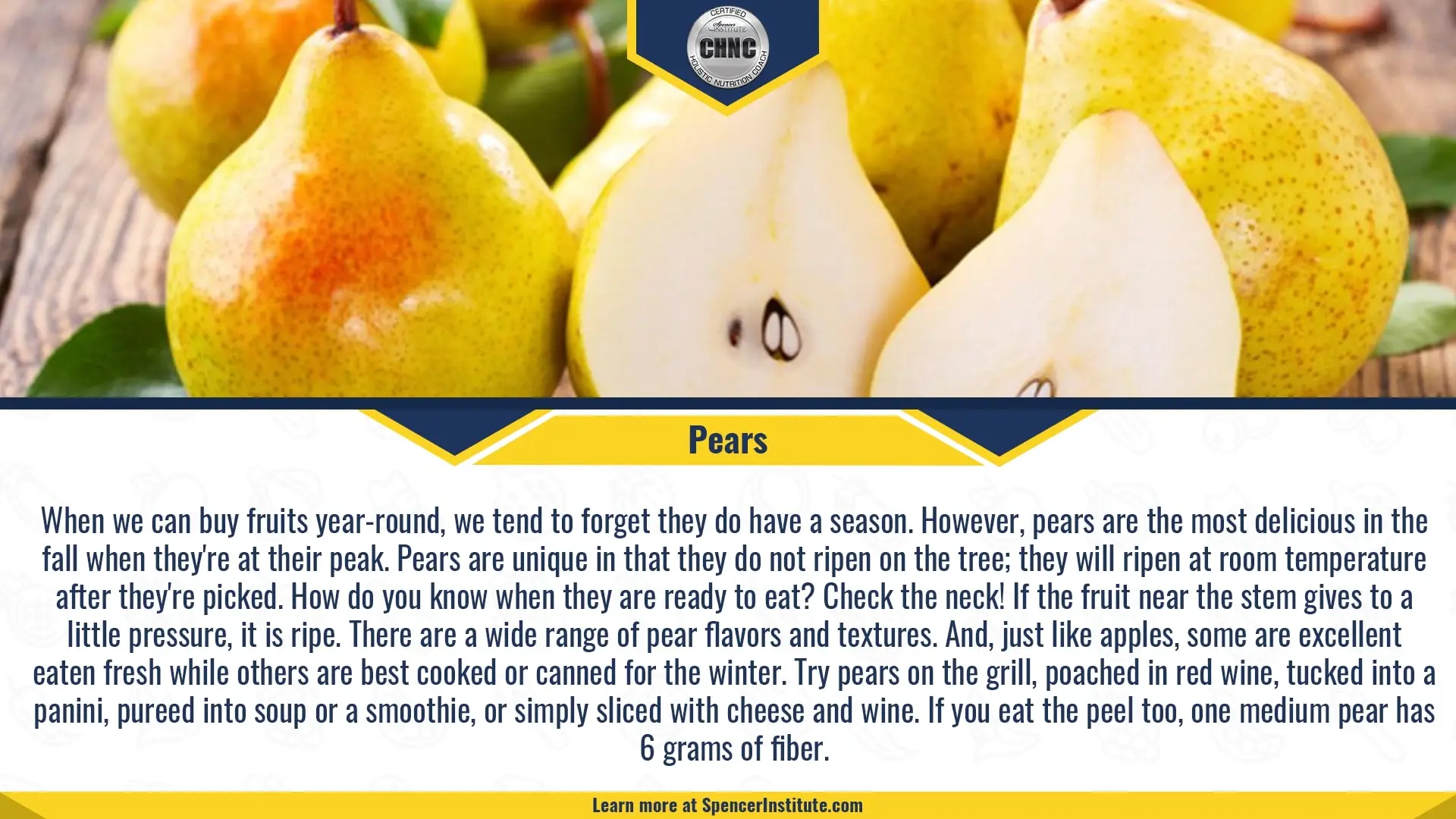 Pears are the most delicious in the fall when they’re at their peak. Pears are unique in that they do not ripen on the tree; they will ripen at room temperature after they’re picked. Pears are a mild, sweet fruit with a fibrous center. They are rich in important antioxidants, flavonoids, and dietary fiber and pack all of these nutrients in a fat-free, cholesterol-free, 100-calorie package. Consuming pears may help with weight loss and reduce the risk of developing cancer, hypertension, diabetes, and heart disease if eaten as part of an overall healthy diet.