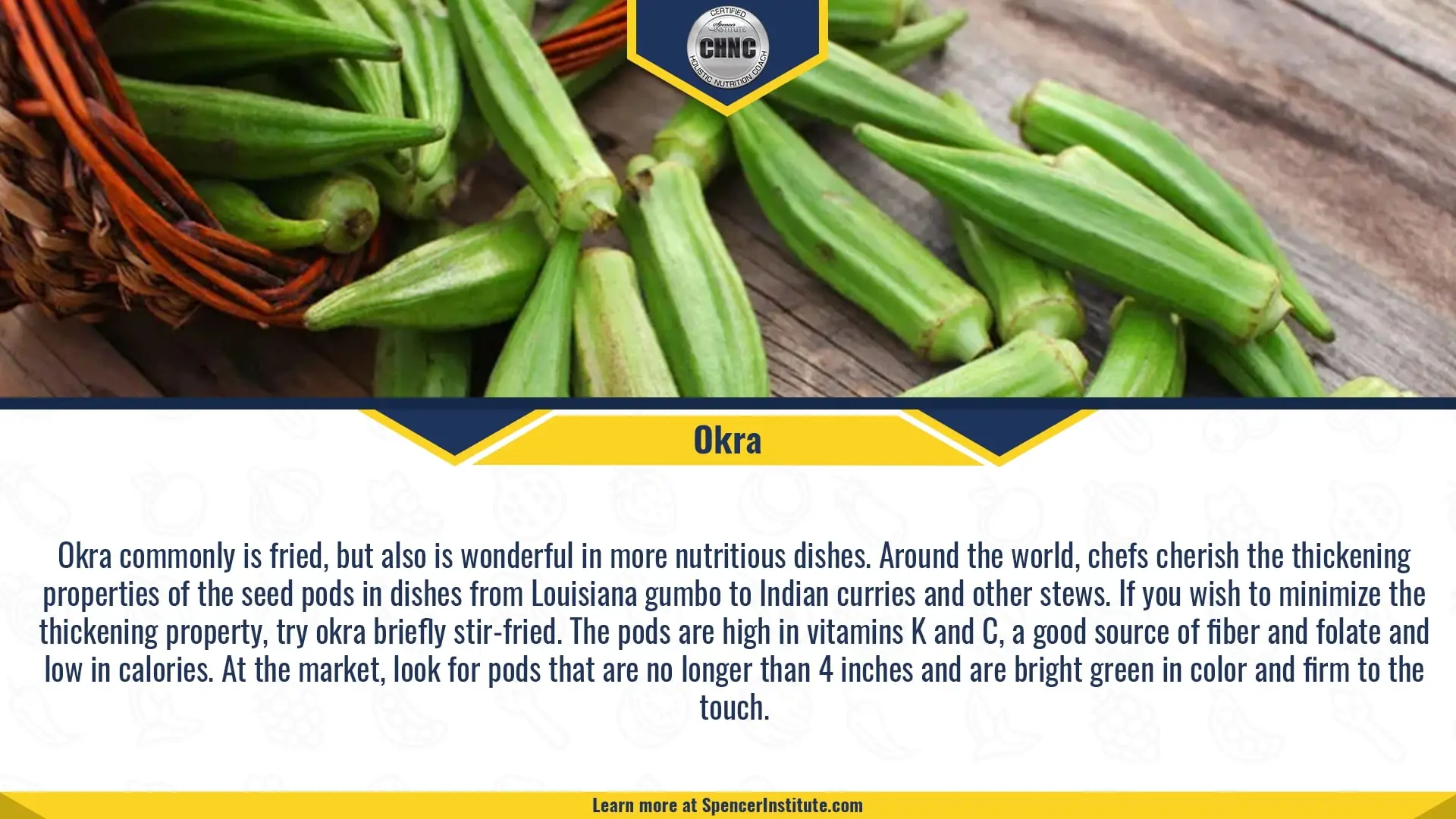 Okra commonly is fried, but also is wonderful in more nutritious dishes. Around the world, chefs cherish the thickening properties of the seed pods in dishes from Louisiana gumbo to Indian curries and other stews. If you wish to minimize the thickening property, try okra briefly stir-fried. The pods are high in vitamins K and C, a good source of fiber and folate and low in calories. At the market, look for pods that are no longer than 4 inches and are bright green in color and firm to the touch.