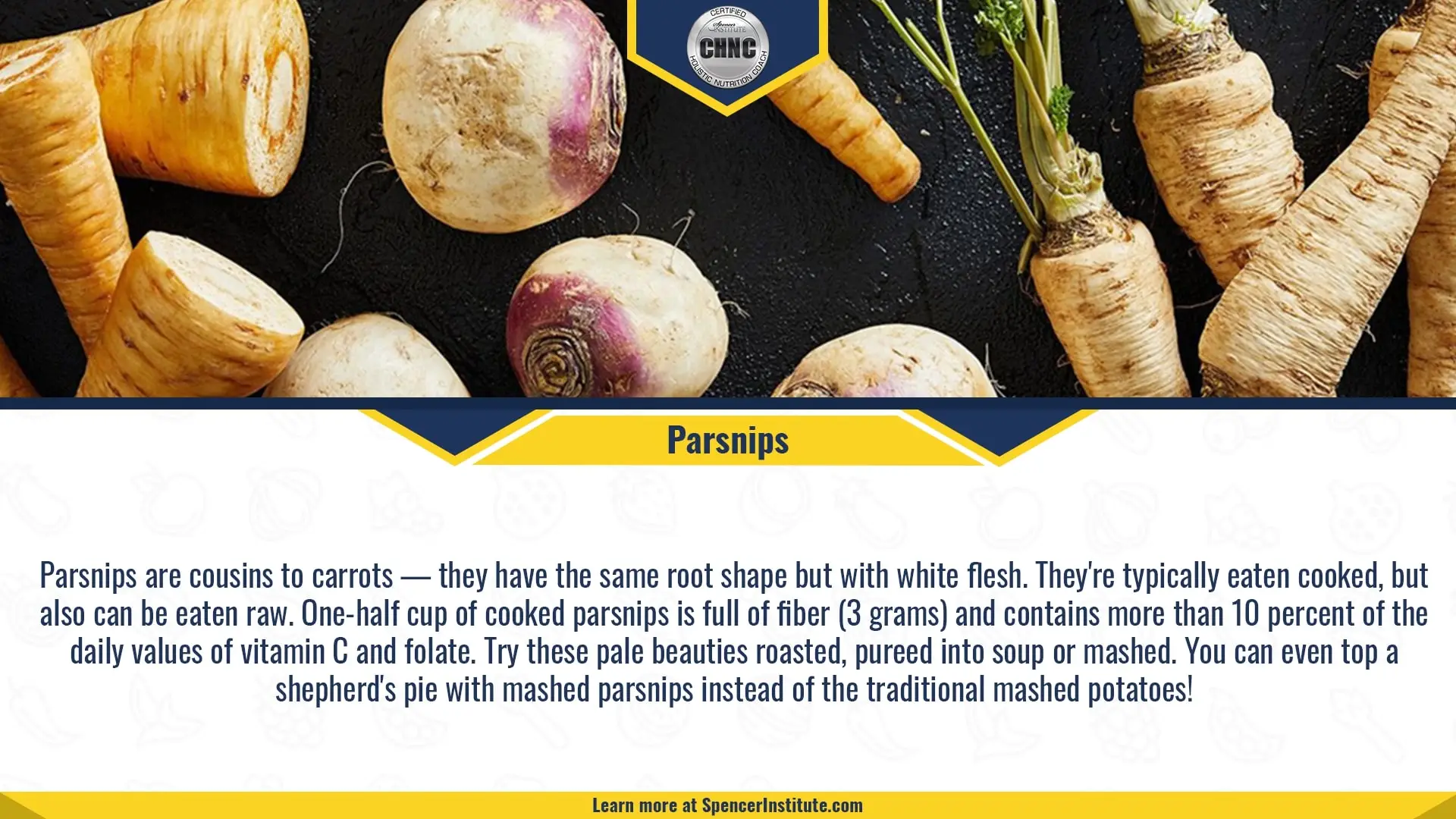 Parsnips have the same root shape as carrots but with white flesh. They’re typically eaten cooked, but also can be eaten raw. One-half cup of cooked parsnips is full of fiber (3 grams) and contains more than 10 percent of the daily values of vitamin C and folate.