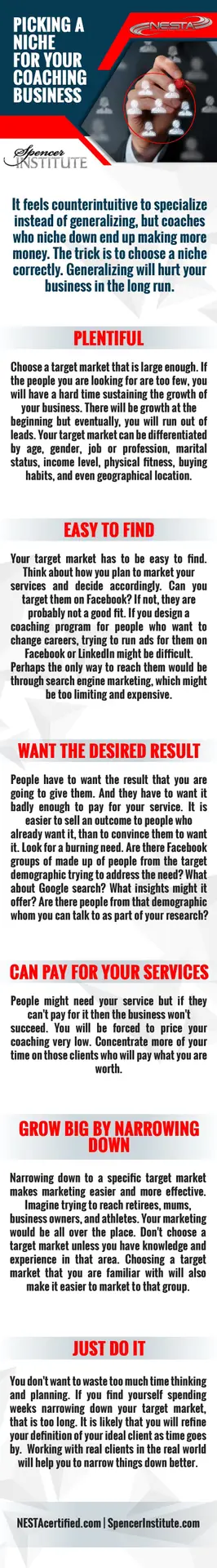 Narrowing down to a specific target market makes marketing easier and more effective. Imagine trying to reach retirees, moms, business owners, and athletes. Your marketing would be all over the place.